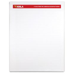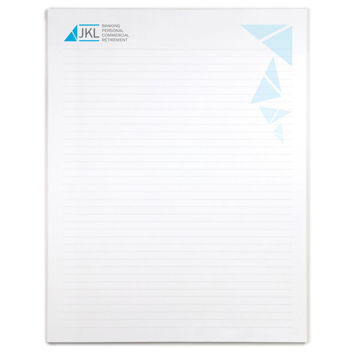 8.5"w X11"h 50 sheet Scratch Pads are USA Made of 50# White Opaque Text stock, with chipboard backer and includes your full color custom graphics on the front side, no bleed, (see "Product Options" for pads imprinted full color no bleed on front and back of each sheet). Perfect for meetings, tradeshows, new product intro and more. Available in 5 stock sizes in 25 and 50 sheet pads. Custom sizes available, call for quotes.