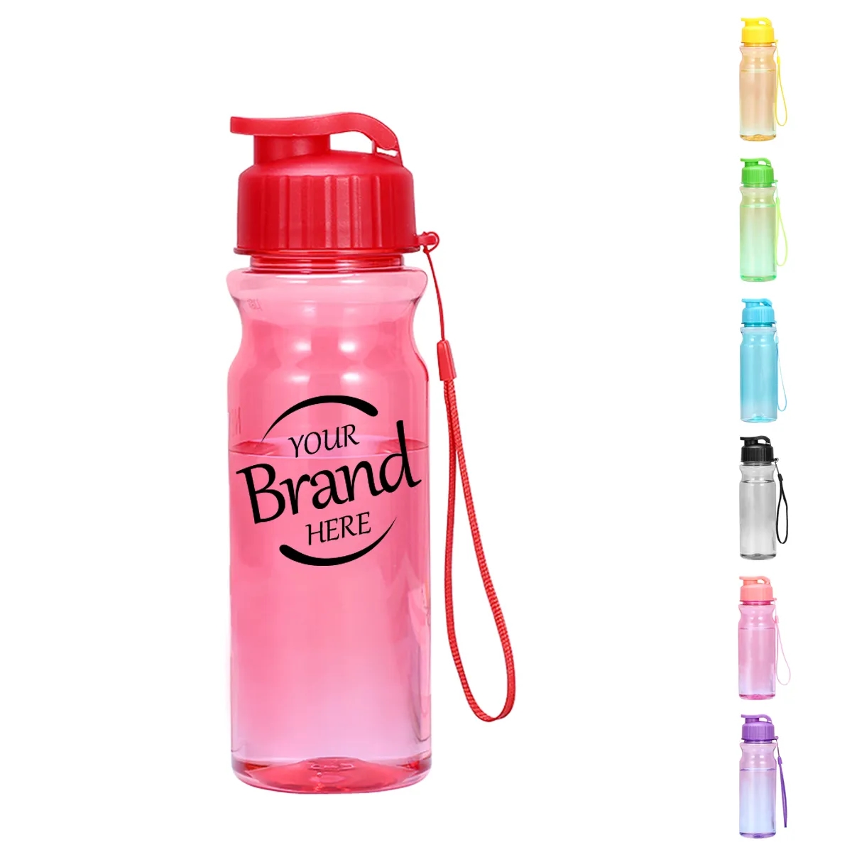 Made from plastic to ensure that water is SAFE to your body and environmentally friendly. This bottle features a strap and a secure flip-top lid for easy one-handed use. The wide-mouth opening makes filling and cleaning a breeze. Suitable for all Kinds of outdoor and Indoor activities such as fitness, gym, running, hiking, cycling, camping, yoga. Enhance your health and feel stronger and energized with the help of the portable water bottle!Enjoy the convenience of always having a bottle on hand. Measured 2.36"*2.36"*8.46".Red,yellow,green,blue,black,pink and purple colors for your choice. Customize your logo or brand name on the front to boost your brand awareness! Shipping via sea for the last price tier.