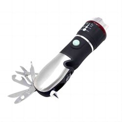 Keep your clients protected with this fantastic emergency multitool! This includes a seatbelt cutter, window breaker, flat head screwdrivers, bottle openers, hex wrenches, knife, phillips head screwdriver, scissors, and wire cutter. This also features an extra bright white COB flashlight with three different settings: high, low, and flashing. You can push the button to turn on and off, and even adjust the beam with push pull zoom. Lastly, there are three AAA batteries included.