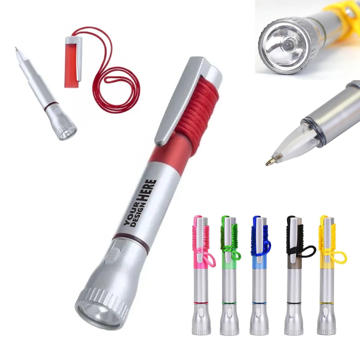The flashlight with a light-up pen made of plastic, move the little switch towards the pen and the pen itself lights up, move the switch towards the light and the flashlight brightly illuminates, the necklace can hang around your neck wherever you go. Light up your writing and keep your essentials handy with this multi-functional LED Flashlight Pen. Perfect for on-the-go professionals, outdoor enthusiasts, or as a practical giveaway item, this pen-flashlight combo offers convenience and style in one compact design.
