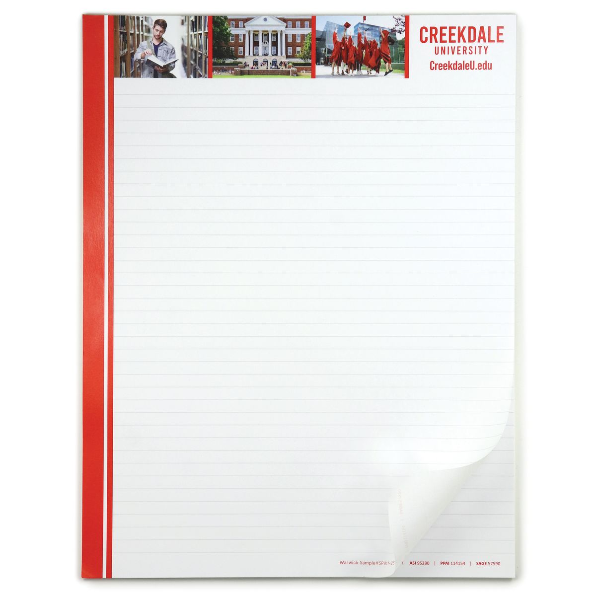 8.5"w X11"h 25 sheet Scratch Pads are USA Made of 50# White Opaque Text stock, with chipboard backer and includes your full color, full coverage custom graphics on the front side (see "Product Options" for pads imprinted full color on front and back of each sheet). Perfect for meetings, tradeshows, new product intro and more. Available in 5 stock sizes in 25 and 50 sheet pads. Custom sizes available, call for quotes.